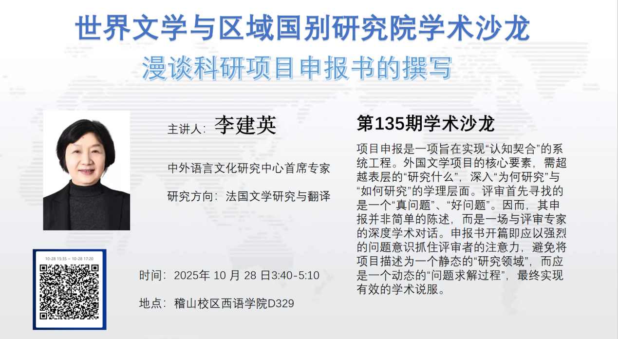 主讲人简介:李建英,中外语言文化研究中心首席专家研究方向:法国文学研究与翻译项目申报是一项旨在实现“认知契合”的系统工程。外国文学项目的核心要素,需超越表层的“研究什么”,深入“为何研究”与“如何研究”的学理层面。评审首先寻找的是一个“真问题”、“好问题”。因而,其申报并非简单的陈述,而是一场与评审专家的深度学术对话。申报书开篇即应以强烈的问题意识抓住评审者的注意力,避免将项目描述为一个静态的“研究领域”,而应是一个动态的“问题求解过程”,最终实现有效的学术说服。