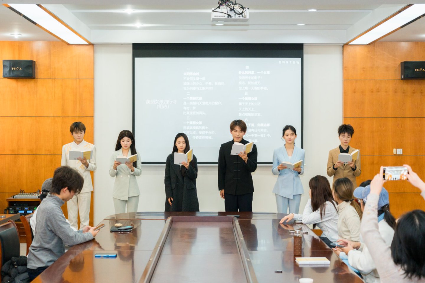讲座中,艺术学院胡依璐,胡程馨,徐佑溢,刘海迅,王鑫,万晋荣六位同学倾情朗诵了多首布拉加诗歌的中译佳作,声情并茂的演绎为现场增添了浓厚的诗意氛围,也让听众更直观地感受到布拉加语言的魅力与思想的深度。